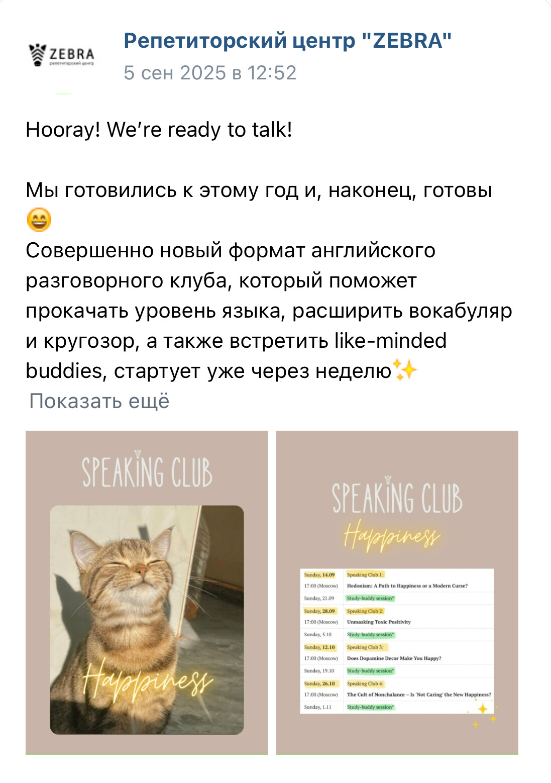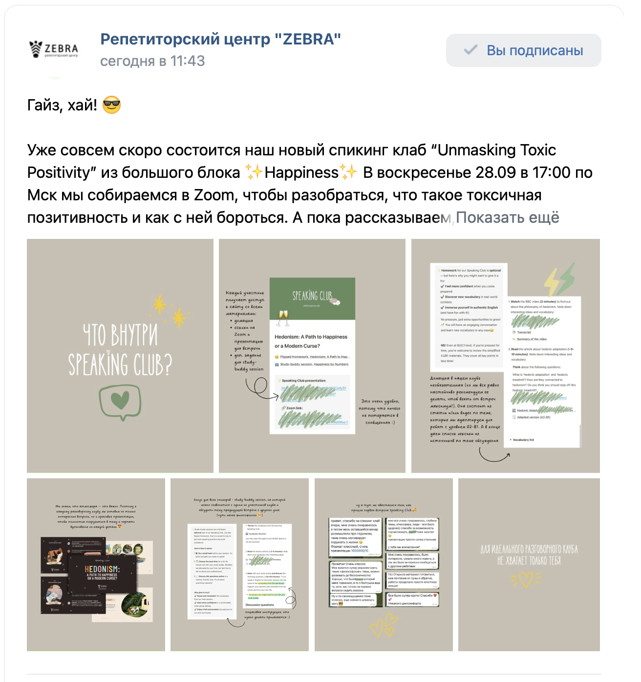 А еще быть в курсе расписания и тем ближайших встреч клуба? Подпишитесь на нас в VK (в других соцсетях нас можно найти по нику @zebra_center).