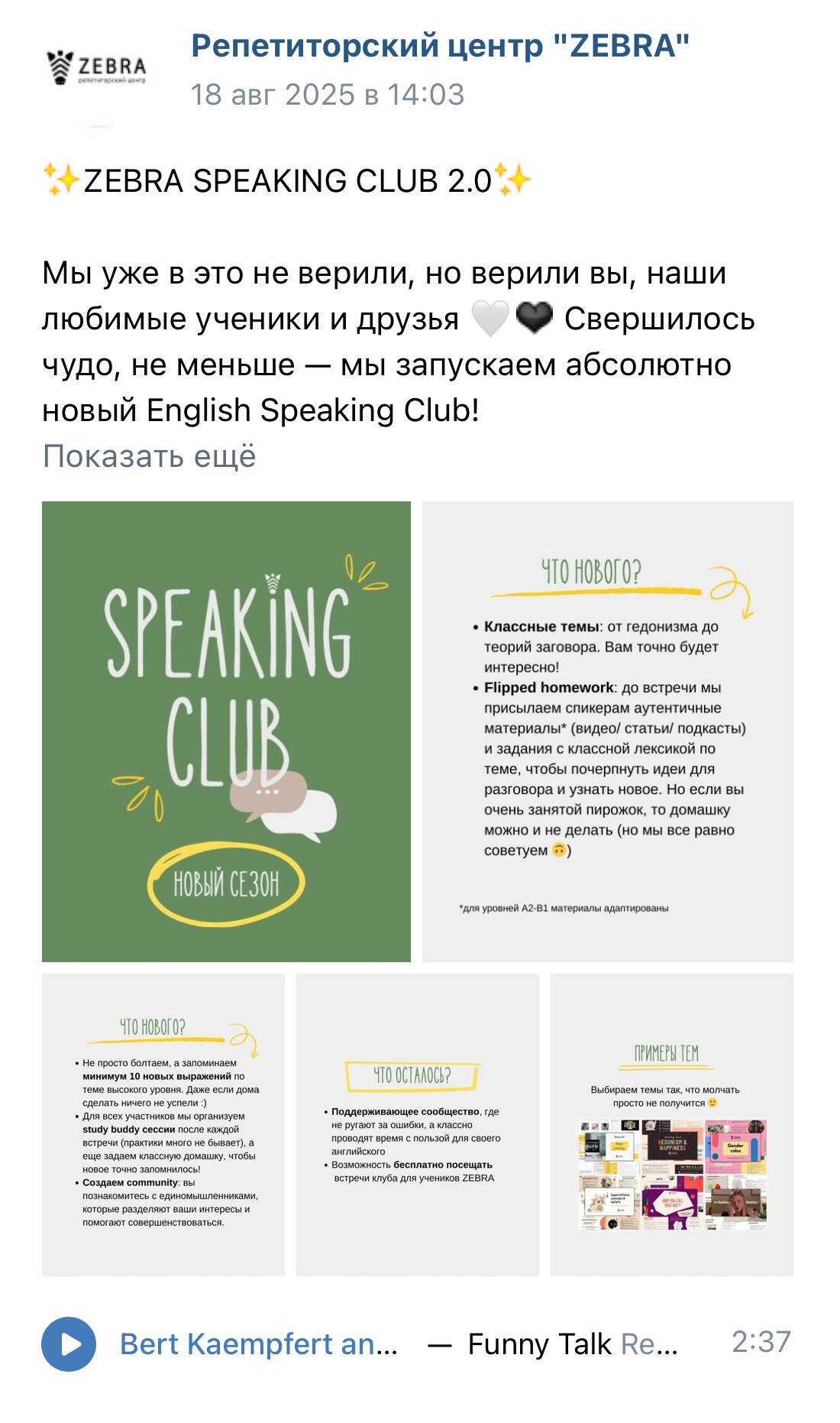 Занимаюсь в Зебре уже не первый год, и очень классно, что помимо обычных занятий можно посещать спикинг-клабы. Это дает возможность не только прокачать разговорный навык и не бояться ошибиться, выражая свои мысли, но и мотивирует еще усерднее заниматься, т.к. ты видишь уровень других учеников школы, повышаешь свой словарный запас разными разговорными фразами. Темы всегда разные, интересные и аутентичные, атмосфера уютная и дружелюбная. Всем рекомендую .